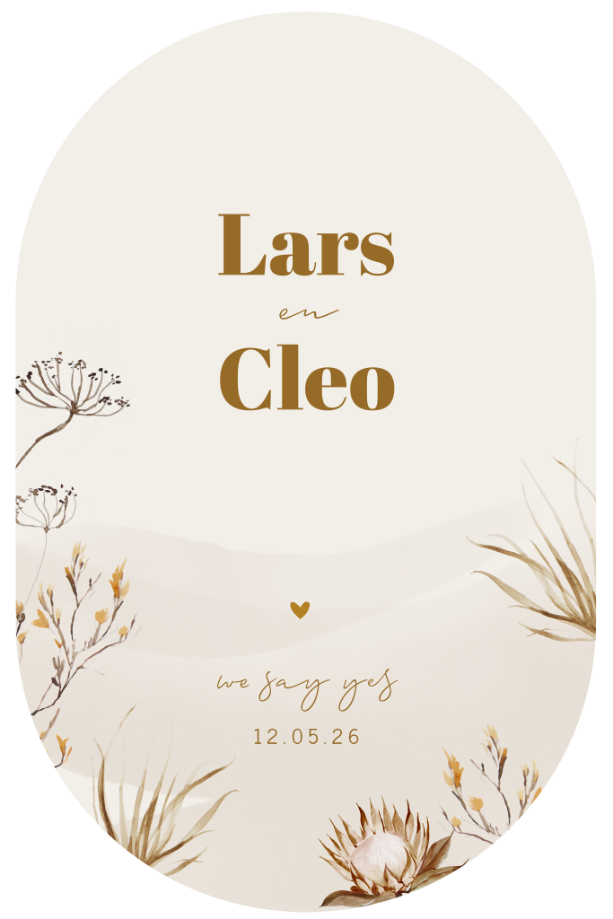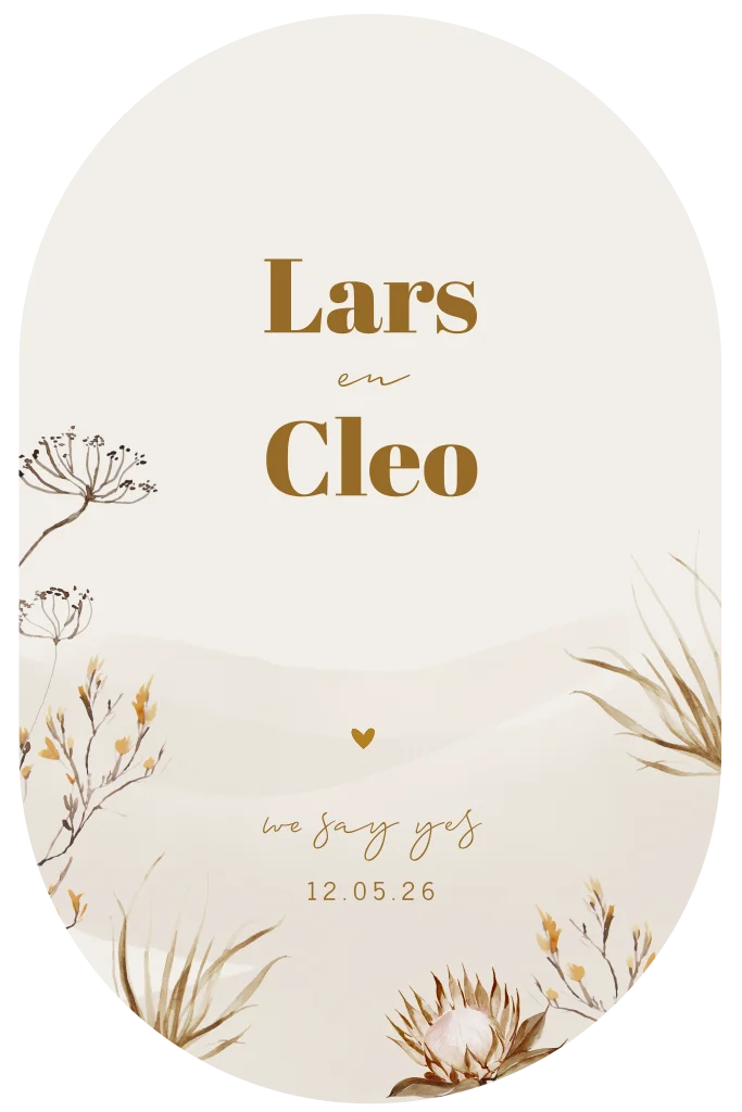 nieke trouwkaart in een aparte vorm. Deze huwelijksuitnodiging met mooie droogbloemen en lichte aquarel vegen is gesneden in een ovale vorm. De trendy natuurlijke aardetinten geven deze kaart een rustige en stijlvolle uitstraling. De kleuren en lettertypes kun je aanpassen in de editor. Hulp nodig? We helpen je graag.