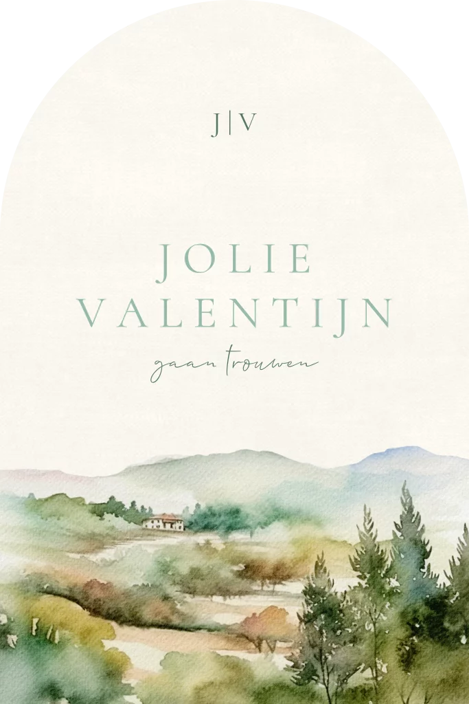 Uniek geïllustreerd landschap trouwkaart in aparte vorm. Deze trouwkaart wordt gesneden in een boogvorm en heeft een prachtige aquarel schildering van een mediterraans landschap. De combinatie van de aparte vorm met een rustig mediterraans landschap maakt dit kaartje werkelijk bijzonder en zal zeker de aandacht trekken. Bestel vandaag nog deze exclusieve huwelijksuitnodiging.
