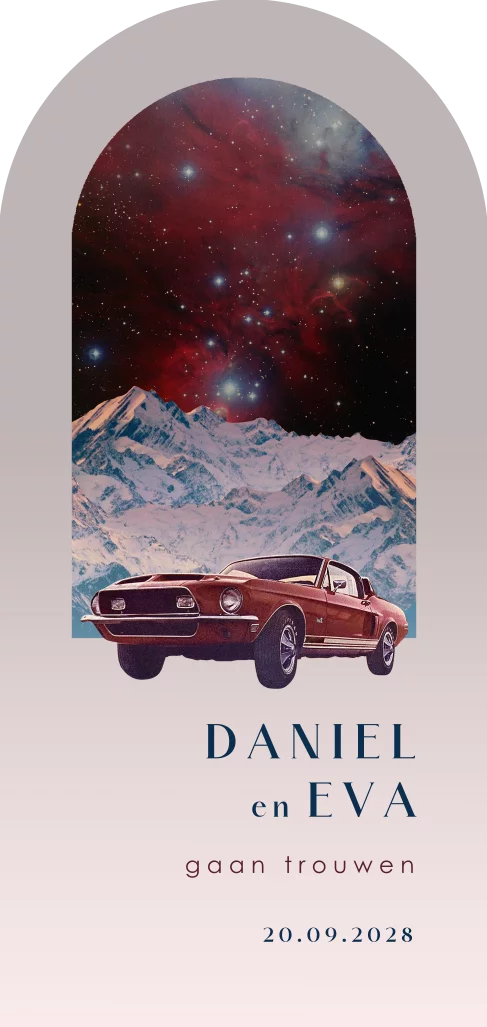 Heb jij iets met auto's? Dan is deze trouwkaart een perfecte keuze! Deze gave trouwkaart heeft een boogvorm en een avontuurlijk thema. Op deze kaart zie je een retro auto, een mooi landschap van bergen en de ruimte. De trouwkaart is in rode en roze kleurtinten vormgegeven en dit past perfect bij jullie liefde. In de online editor kun je deze kaart naar eigen wens aanpassen.