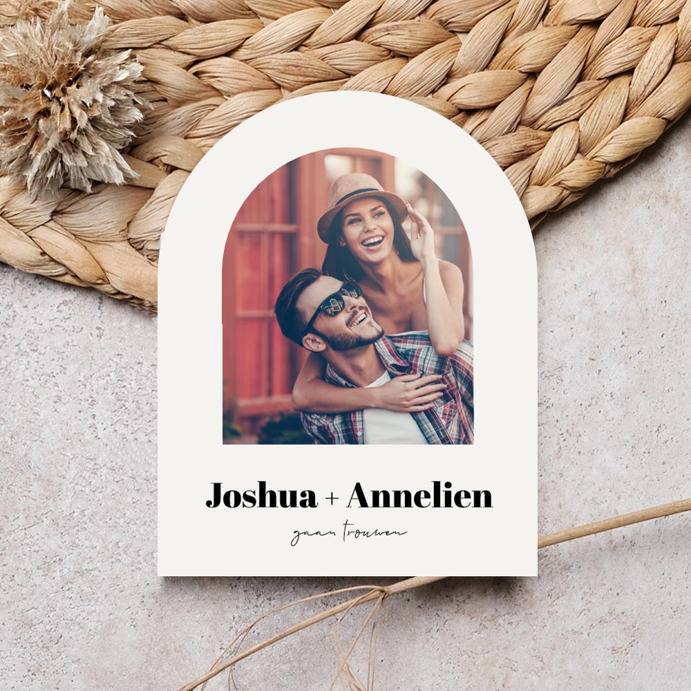 Prachtige trouwkaart in aparte vorm met eigen foto. De kaart is gesneden in de vorm van een boog. Je kunt de uitnodiging personaliseren met een stralende foto van jullie samen. De mogelijkheid om een eigen foto toe te voegen maakt deze kaart bijzonder persoonlijk en origineel, waardoor jullie liefde perfect weerspiegeld wordt.
