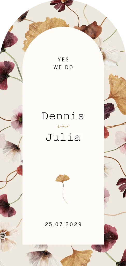 Houden jullie ook zo van bloemen? Kies dan voor deze bloemen huwelijksuitnodiging in een bijzondere vorm. Deze trouwkaart is gesneden in de vorm van een arch en er is gebruik gemaakt van natuurlijke trendy kleuren. De teksten op de voorzijde zijn omkaderd met aquarel bloemen. Pas dit unieke kaartje naar je eigen smaak aan in de editor. En laat het ons gerust weten als je daarbij hulp nodig hebt!