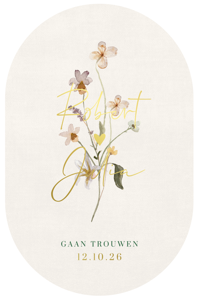 Unieke trouwkaart in een aparte vorm; voor jullie als uniek liefdeskoppel. Deze moderne huwelijksuitnodiging met prachtige aquarel bloemen is gesneden in een ovale vorm. De sprankelende koperfolie voor de lichte linnenlook achtergrond, maakt de kaart nóg exclusiever. Kleuren en lettertypes kun je aanpassen in de editor. Hulp nodig? Mail, chat of bel ons gerust.