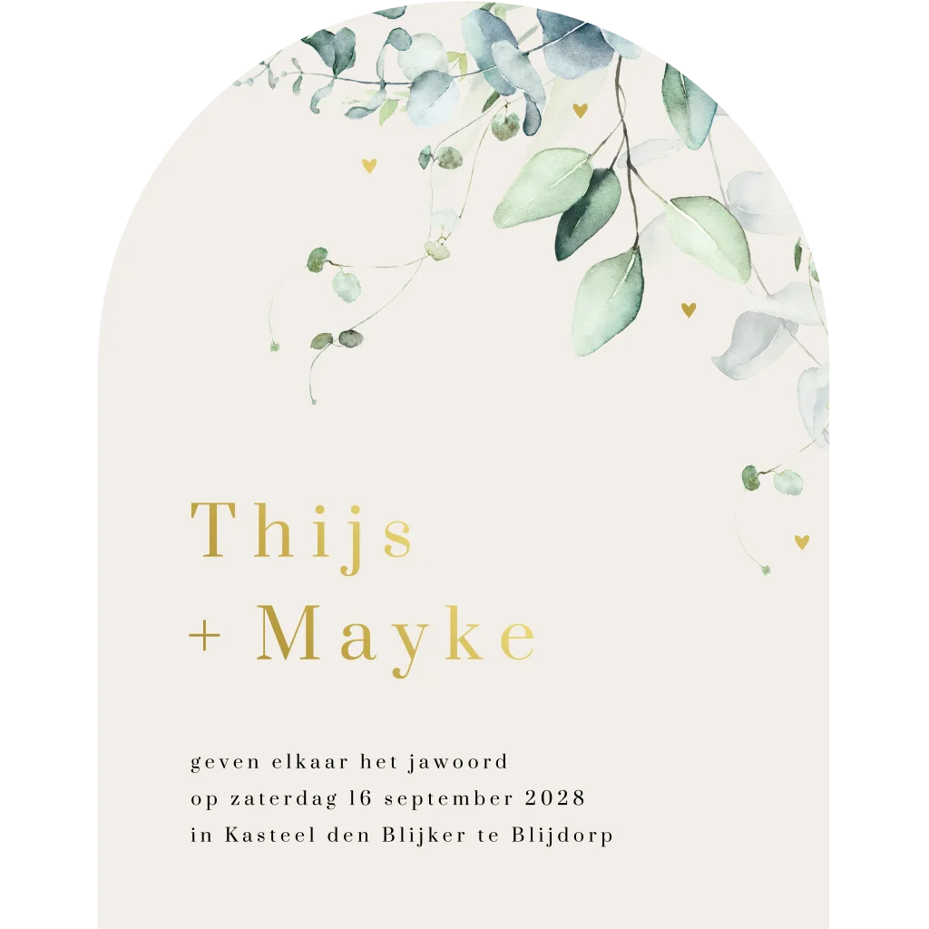 Stijlvolle uitnodiging voor jullie huwelijk in bijzondere vorm. Deze trouwkaart wordt gesneden in de vorm van een boog. Op deze huwelijksuitnodiging staan mooie aquarel eucalyptus takjes in zachte groene tinten. De namen van het bruidspaar en de hartjes op de voorzijde worden gedrukt in echt goudfolie wat deze trouwkaart een extra luxe tintje geeft. Ook mogelijk met zilverfolie, koperfolie of roséfolie. Dit pas je eenvoudig aan in onze ontwerpmodule. Vragen? Stel ze gerust. We helpen je graag!