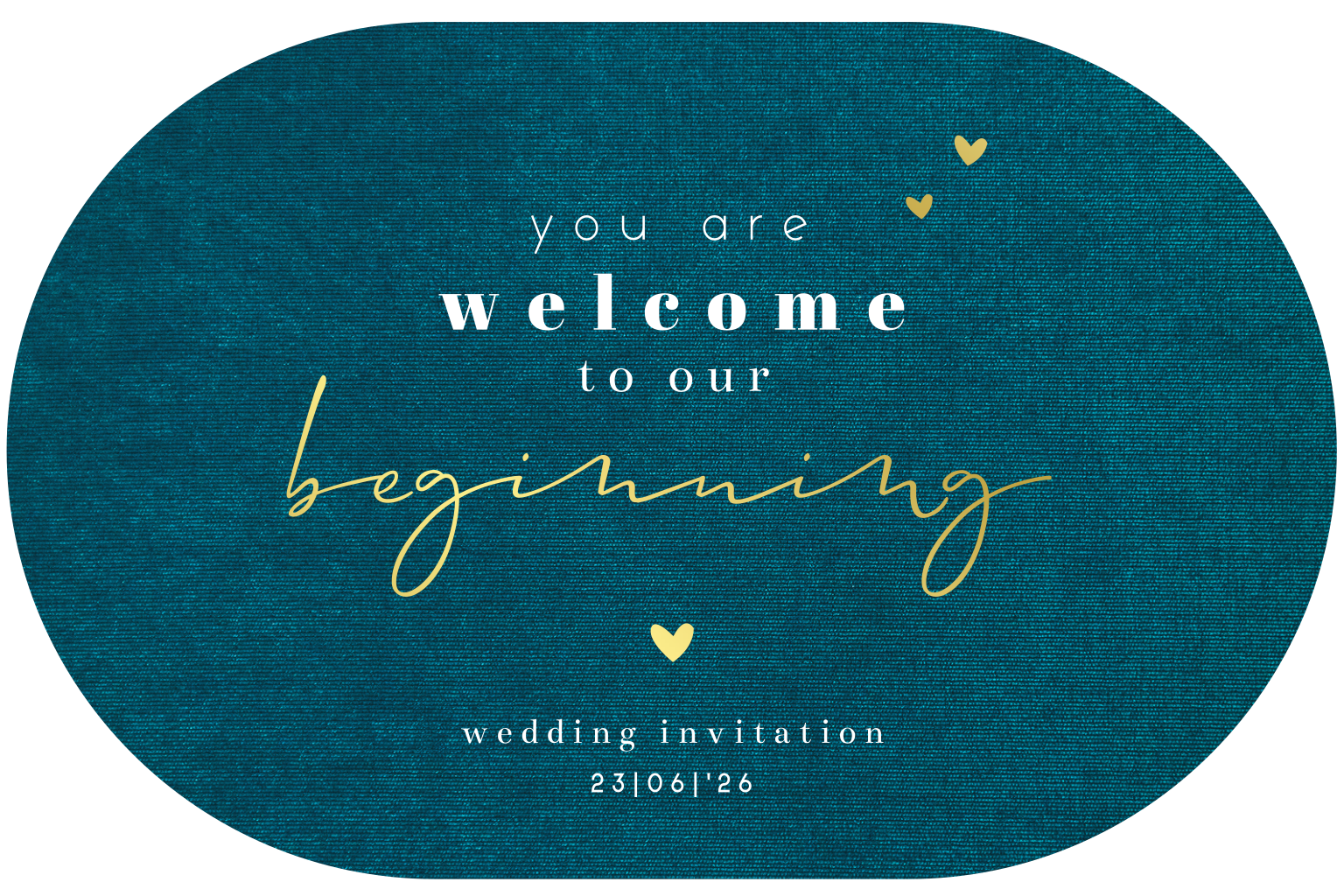 Bijzondere trouwkaart in aparte vorm, speciaal voor de dág van jullie leven! Deze huwelijksuitnodiging is gesneden in een ovale vorm. Deze kaart is voorzien van goudfolie, wat dit kaartje een luxe uitstraling geeft. De fabric achtergrond geeft een zacht, maar stoer sfeertje aan deze kaart. Pas de kaart naar eigen smaak aan in de editor, ook mogelijk met zilverfolie, roséfolie of hoogglans. Hulp nodig bij het ontwerpen? Laat het ons gerust weten.
