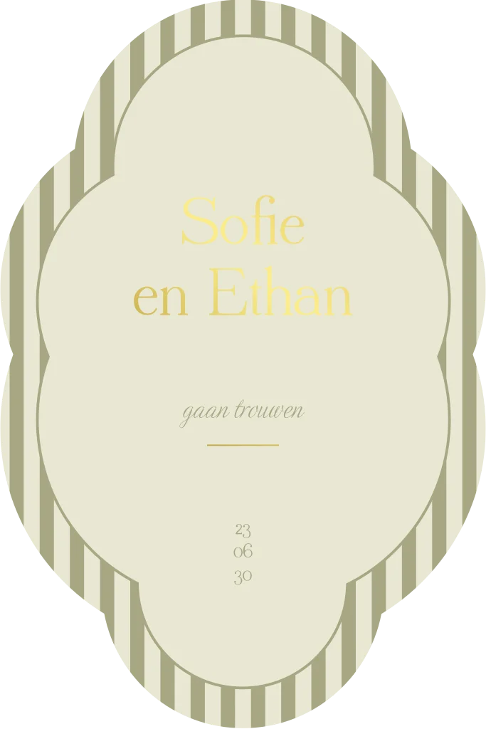 Originele trouwkaart in aparte vorm met luxe goudfolie. Deze groene trouwkaart heeft een klassiek ontwerp met strepen en kader. De goudfolie geeft een luxe glans en zal, samen met de bijzondere vorm, zeker opvallen. Een unieke trouwkaart voor een bijzondere dag. Pas de teksten, kleuren en lettertypes naar je eigen smaak aan in de editor. Bestel van te voren een proefdruk met een sample setje zodat je het kaartje in het echt kan bewonderen.