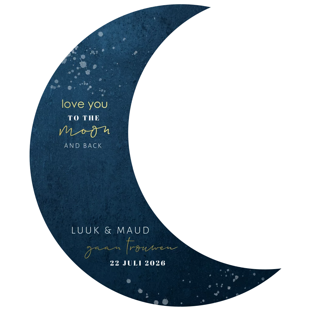 Unieke trouwkaart in bijzondere vorm met goudfolie! Deze kaart is gesneden in de vorm van een maan. Want jullie houden van elkaar: to the moon and back! De achtergrond van deze kaart is donkerblauw en de lichtere spetters erop, geven een speels effect. De folie kleur pas je eenvoudig aan in onze editor. Hulp nodig? We helpen je graag!