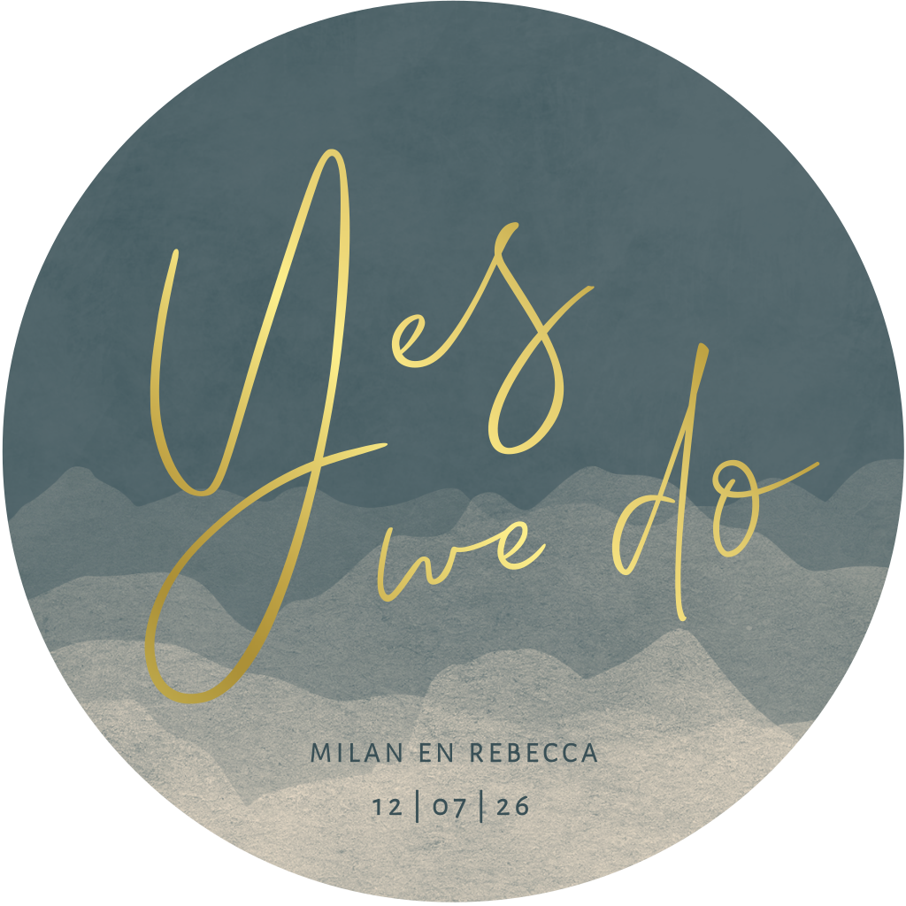 Ronde trouwkaart met de tekst Yes we do in écht goudfolie. Op de achtergrond golfjes en een velvet look.