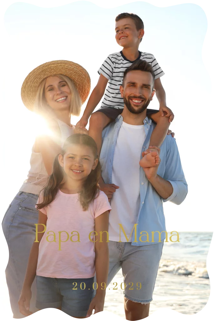 Een speelse trouwkaart met golvende randen met de tekst 'Papa en Mama gaan trouwen'. Het goudfolie zorgt voor een extra vleugje luxe. Voeg jullie eigen foto toe van jullie gezin voor de persoonlijke touch. Pas deze trouwkaart naar eigen wens aan in de online editor. Hulp nodig? Ons team helpt je graag!