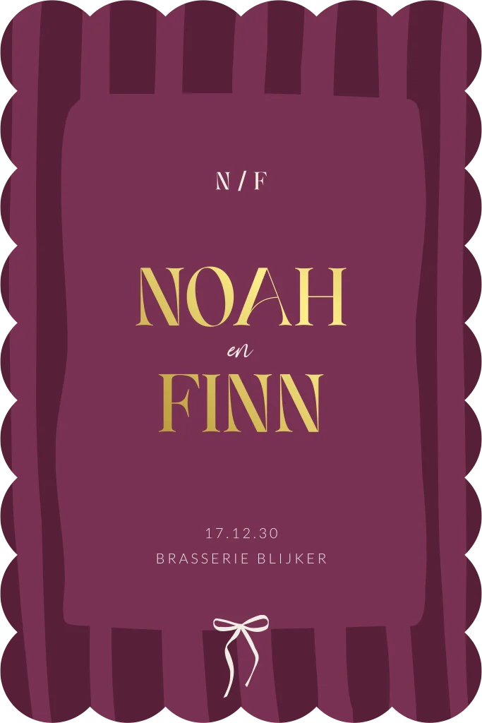 Trendy en hippe trouwkaart in aparte vorm. Deze trouwuitnodiging heeft een golvende rand met een strepen patroon en kader met jullie namen in écht goudfolie. De goudfolie geeft een luxe afwerking aan deze originele huwelijksuitnodiging voor een verjaardag. De kleurencombinatie is helemaal volgens de laatste trends. Pas alles geheel naar eigen wens aan in de editor. De berry envelop maakt dit kaartje helemaal in stijl af.