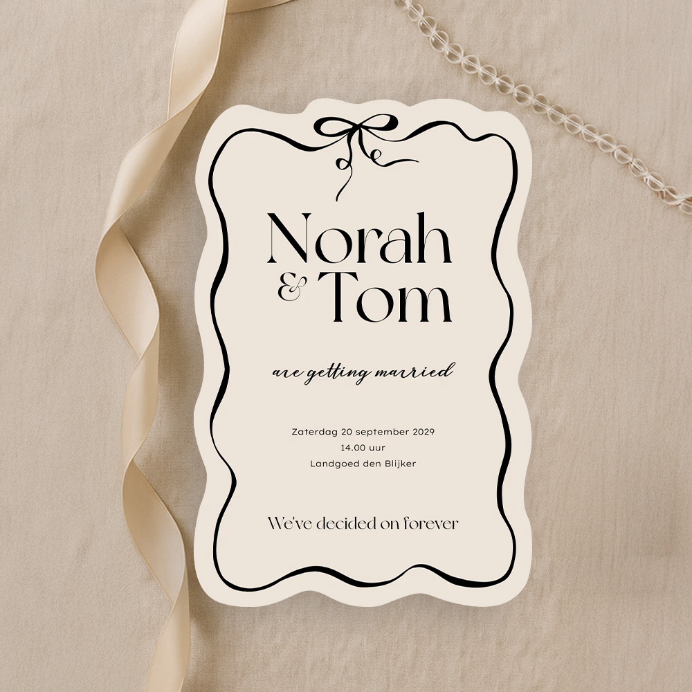 Een prachtige speelse trouwkaart met een aparte vorm. Deze trouwkaart is in beige kleurtint vormgegeven met een golvend kader een een geïllustreerde strik. Pas teksten en kleuren aan in onze online editor voor jullie persoonlijke touch. Maak deze kaart helemaal af met de bijpassende metallic beige envelop.