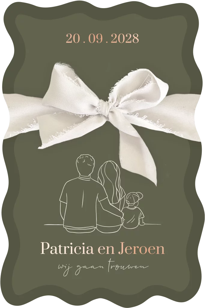 Deze trouwkaart met lint, een aparte vorm en een toffe lijntekening is een unieke keuze voor stellen die op zoek zijn naar iets bijzonders en origineels. De kaart straalt een tikkeltje stoerheid uit met het zachte effect van het chiffon lint. Deze trouwkaart is in een aparte vorm met organische uitsnede gesneden. Pas de teksten, kleuren en lettertypes eenvoudig aan in de editor en maak het kaartje af met een zand envelopkleur.