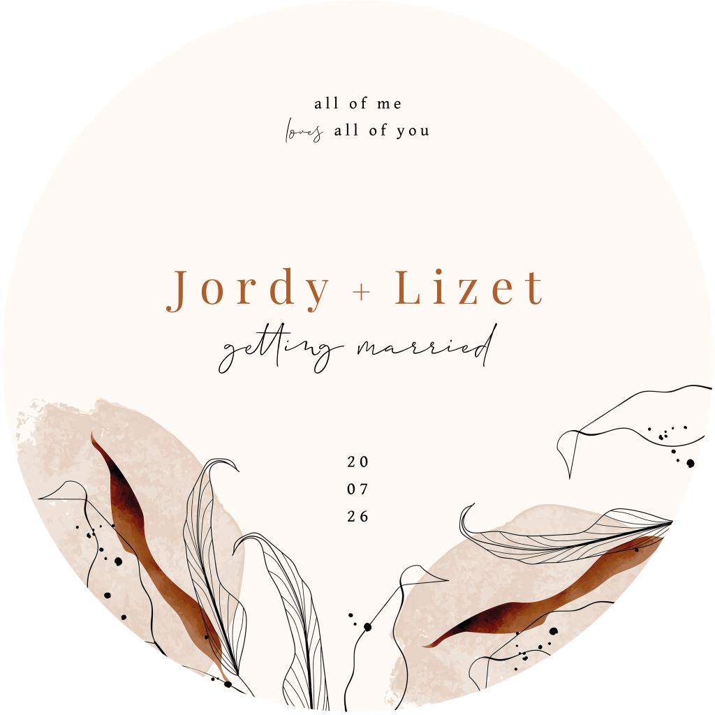 Deze fraaie trouwkaart is gesneden in de vorm van een cirkel. Op deze ronde huwelijksuitnodiging bladeren als lijntekening en aquarel vlakken.