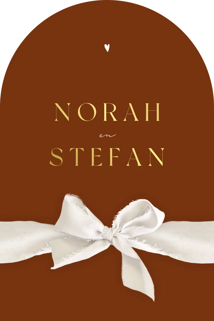 Stijlvolle boogvorm trouwkaart met echt lint en foliedruk. Deze trouwkaart heeft een stijlvolle, rustige uitstraling. De goudfolie en de zijden strik maken de kaart helemaal af. Het lint kun je apart erbij bestellen. Deze wordt niet standaard meegeleverd maar is hier bij te bestellen.