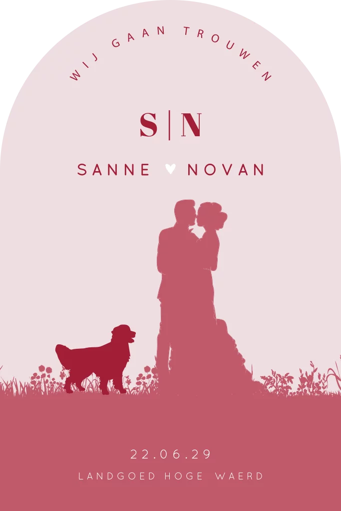 Een fantastische boogvorm trouwkaart met silhouet van een bruidspaar en een hond. Betrek zo jullie huisdier op de trouwkaart. Deze kaart heeft romantische roze ton-sur-ton kleuren. De aparte vorm geeft een speels effect. Pas jullie namen en initialen aan in onze online editor en trek zeker de aandacht met deze romantische kaart. Bestel vandaag nog deze exclusieve huwelijksuitnodiging en maak er een onvergetelijke huwelijksdag van.