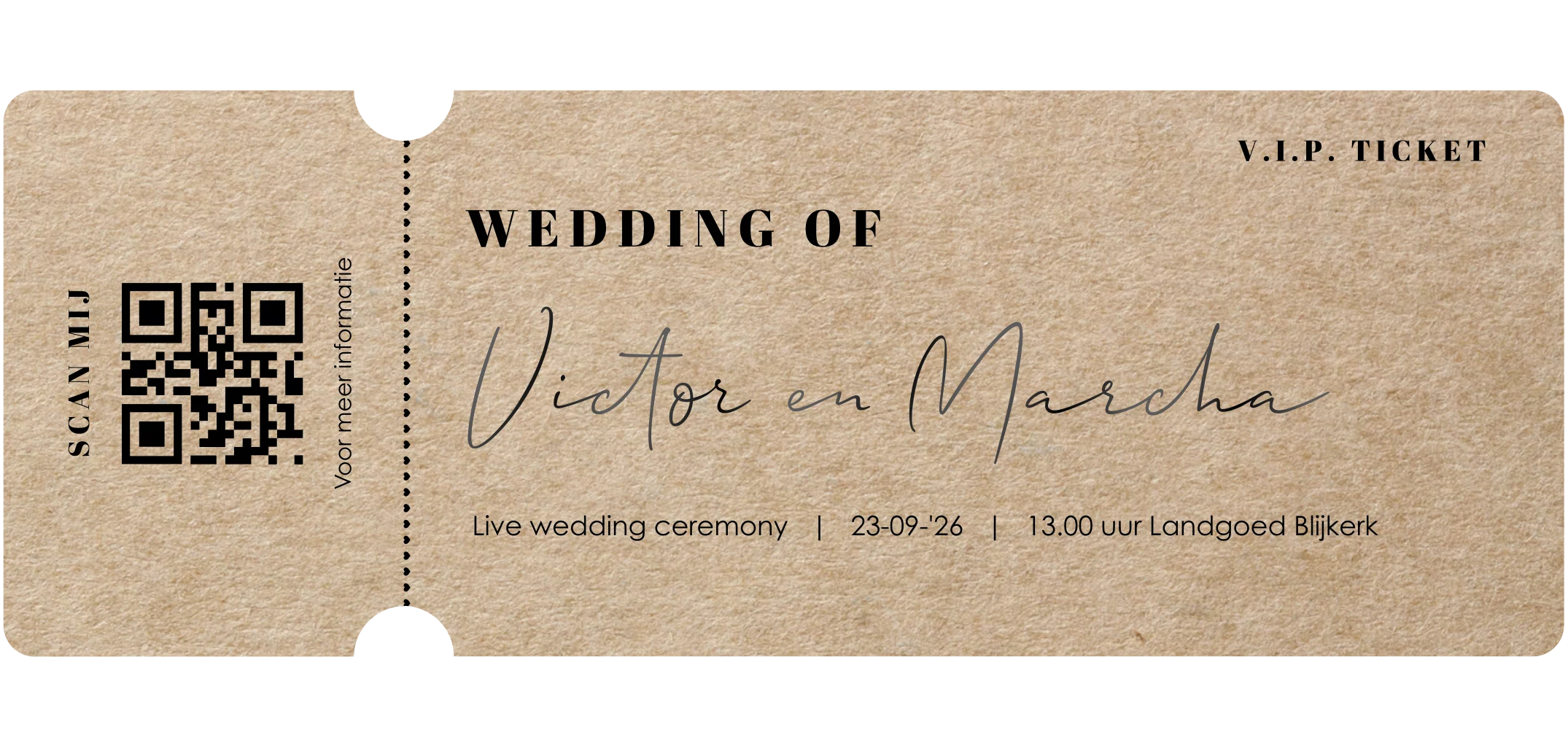 Unieke trouwkaart voor jullie onvergetelijke bruiloft. Deze huwelijksuitnodiging is gesneden in de vorm van een ticket: speciaal voor VIP's. O.a. de namen van het bruidspaar worden gedrukt in écht zwartfolie, wat deze kaart helemáál exclusief maakt. Liever een andere kleur? Dit pas je eenvoudig aan in onze ontwerpmodule.