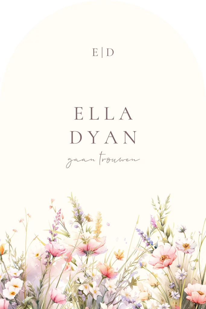 Een fantastische boogvorm trouwkaart met veldbloemen. Deze trouwkaart heeft een stijlvolle, rustige uitstraling. Pas jullie namen en initialen aan in onze online editor en trek zeker de aandacht met deze romantische kaart. Bestel vandaag nog deze exclusieve huwelijksuitnodiging en maak er een onvergetelijke huwelijksdag van.