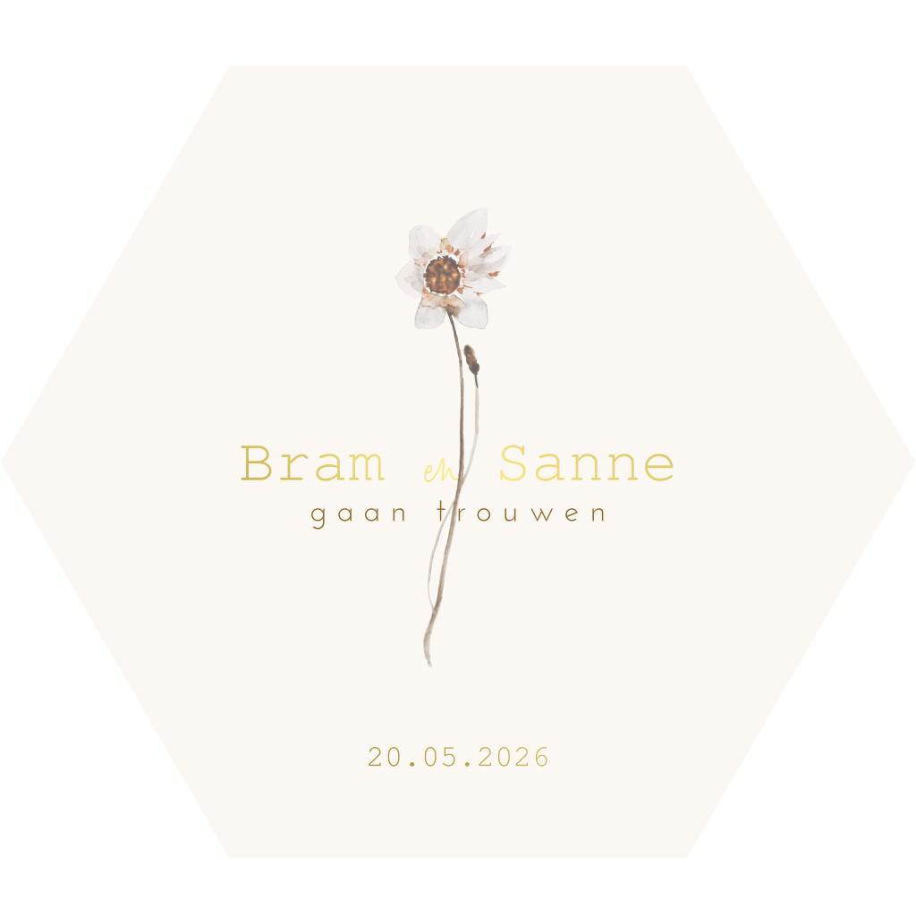 Op zoek naar een bijzondere uitnodiging voor jullie huwelijk? Deze trouwkaart heeft een unieke hexagon vorm en dat maakt het kaartje nét even anders. De kaart heeft een rustige uitstraling met een aquarel bloem. Jullie namen en de datum van de bruiloft worden in écht goudfolie gedrukt. De folie heeft een mooie glans en geeft deze trouwkaart een extra luxe uitstraling.
