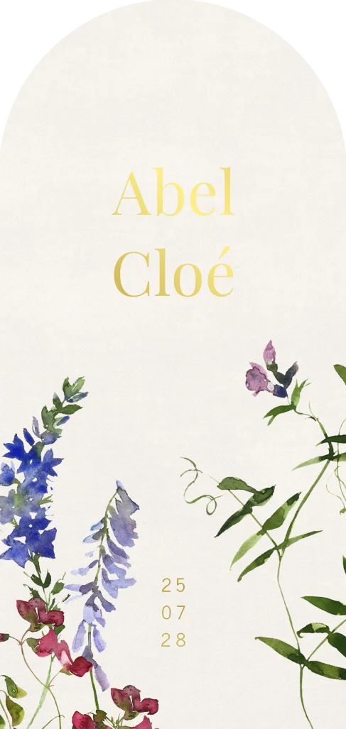 Prachtige huwelijksuitnodiging in een bijzondere vorm. Deze trouwkaart is gesneden in de vorm van een arch. Op deze kaart kleurrijke aquarel veldbloemen. Deze trouwkaart is voorzien van goudfolie, wat echt een luxe uitstraling geeft! De kleur van de foliebedrukking kun je in de ontwerpmodule aanpassen. Hulp nodig? We staan voor je klaar!