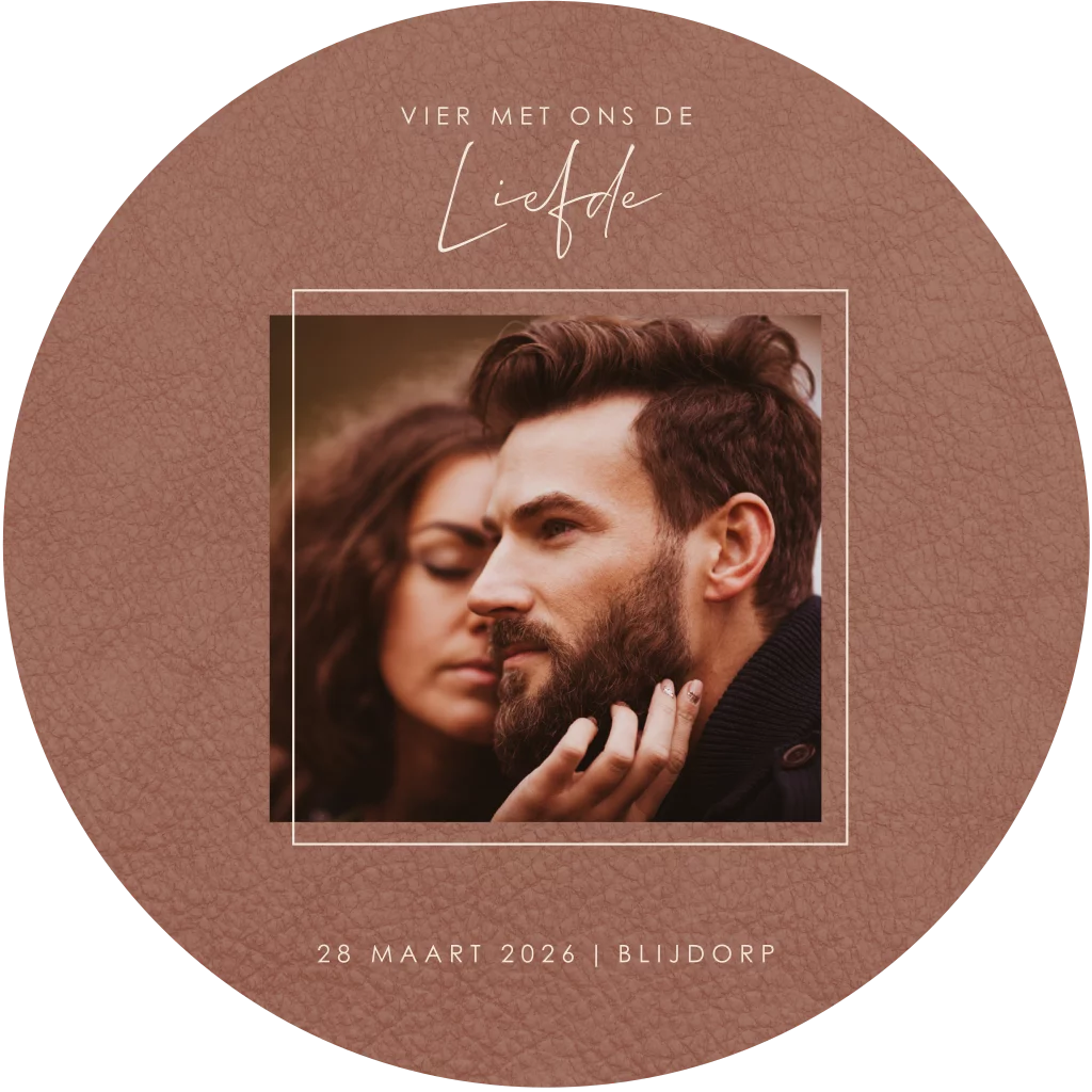 Stijlvolle trouwkaart in ronde vorm met foto en lederlook
