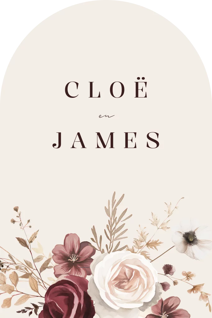 Deze trouwkaart heeft een stijlvolle en rustige uitstraling. Met prachtige veldbloemen en een stijlvolle boogvorm heeft deze trouwkaart een romantische stijl. Een prachtige trouwkaart voor jullie grote dag! Voeg jullie namen of initialen eenvoudig toe in onze online editor en maak er een exclusieve huwelijksuitnodiging van.