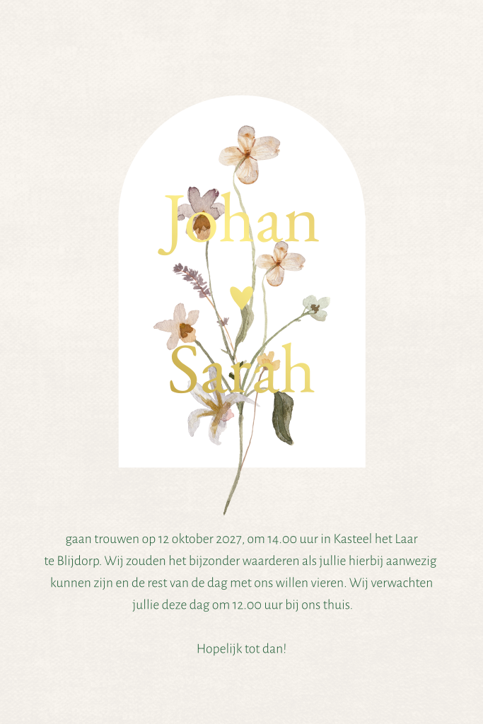 Ben je op zoek naar een unieke en originele huwelijksuitnodiging? Dan is deze trouwkaart met doorkijkje perfect voor jou! Deze kaart is gemaakt van hoogwaardig materiaal en heeft een luxe uitstraling door de foliedruk. Ook is deze kaart voorzien van een stans, waardoor het een uniek en origineel detail is. De bloemen, in combinatie met de beige achtergrond en goudfolie, geven een klassieke uitstraling aan deze trouwuitnodiging.
