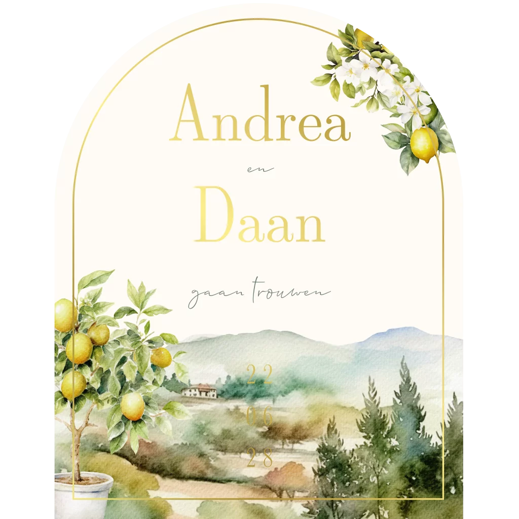 Unieke trouwkaart archvorm met Toscaans landschap, citroenen en folie