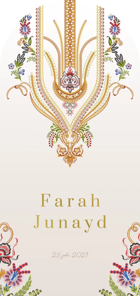 Een stijlvolle Islamitische uitnodiging voor jullie huwelijk in een prachtige boogvorm. Op deze trouwkaart zie je een mooi beige kleurverloop. Jullie namen als bruidspaar zowel op de voorzijde als op de achterzijde van deze kaart is in goudfolie vormgegeven. Dit geeft een extra luxe tintje aan deze schitterende trouwkaart. De aparte vorm, de bloemmotieven en het kleurrijke ontwerp maken deze uitnodiging tot een ware blikvanger. Pas deze Arabische trouwkaart naar eigen wens aan in onze online editor.