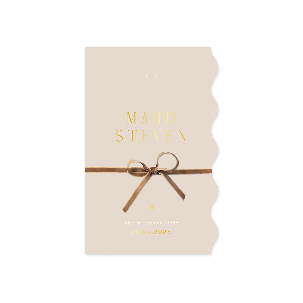 Deze trouwkaart in aparte vorm met een velours taupe lint is een unieke en elegante keuze voor aanstaande bruidsparen. De kaart is voorzien van prachtige folieaccenten die een luxe uitstraling geven, perfect passend bij een bijzondere trouwdag. Het subtiele glanseffect van de folieaccenten en de verfijnde touch van het velours taupe lint zorgen voor een stijlvolle en exclusieve uitstraling. Bestel vandaag nog deze trouwkaart en maak van jullie speciale dag een onvergetelijke ervaring.