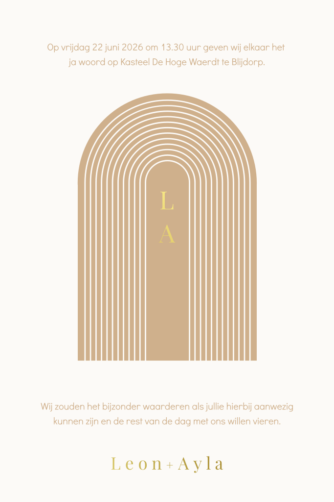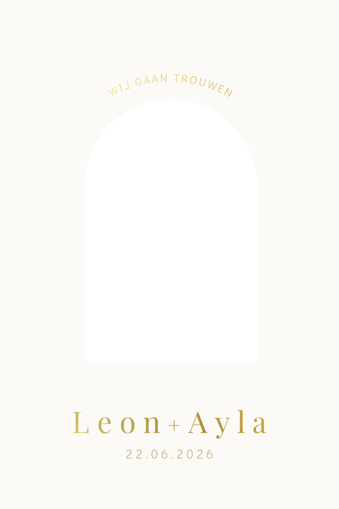 Moderne uitnodiging voor jullie huwelijk, met gouden foliedruk en strakke lijnen in boogvorm. Uniek aan dit kaartje is de uitsnede in de vorm van een boog en het gebruik van foliedruk. Dat geeft een luxe uitstraling aan deze strakke trouwuitnodiging. Door deze uitsnede is een deel van de binnenkant van de kaart zichtbaar met jullie initialen in goudfolie.