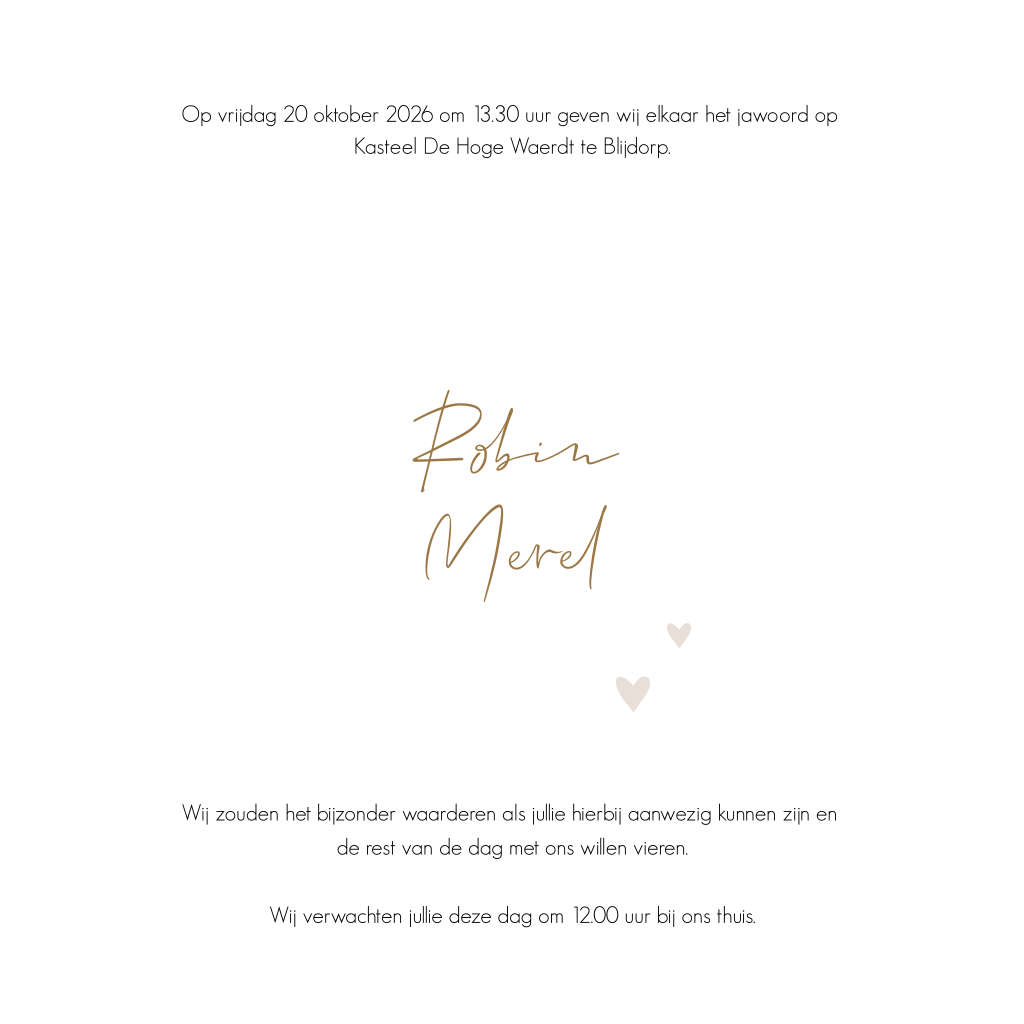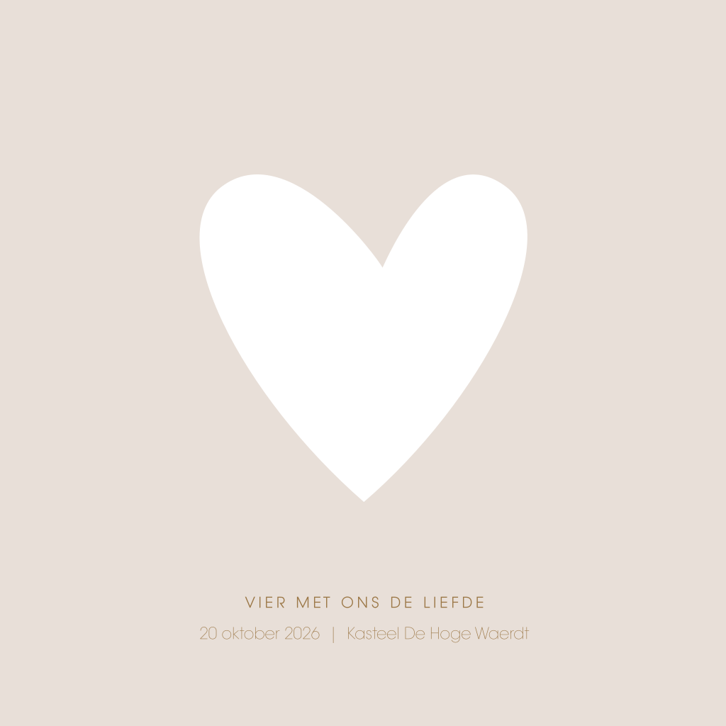 Rustige trouwuitnodiging voor jullie huwelijk. Uniek aan dit kaartje is de uitsnede in de vorm van een hart, waardoor je jullie namen ziet. Door deze uitsnede is een deel van de binnenkant van de kaart zichtbaar. Liever andere kleuren of lettertypes? Dit pas je eenvoudig aan in onze ontwerpmodule.