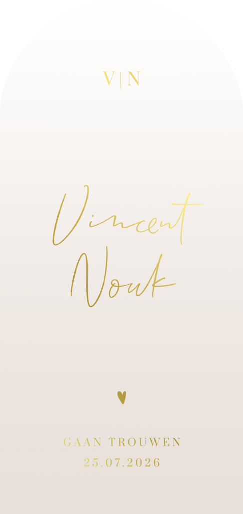 Stijlvolle uitnodiging voor jullie huwelijk in bijzondere vorm. Deze trouwkaart wordt gesneden in de vorm van een boog. Op deze kaart een mooi beige kleurverloop. Alle elementen, waaronder jullie initialen als bruidspaar, op de voorzijde worden gedrukt in echt goudfolie. Dat geeft een enorm luxe tintje aan deze schitterende trouwkaart. Ook mogelijk met zilverfolie, koperfolie of roséfolie. Dit pas je eenvoudig aan in onze ontwerpmodule. Vragen? Stel ze gerust. We helpen je graag!