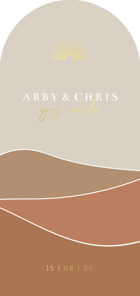 Yes we do! Abstracte huwelijksuitnodiging in een bijzondere vorm. Deze trouwkaart is gesneden in de vorm van een arch en er is gebruik gemaakt van natuurlijke trendy kleuren. Een prachtige combinatie met de luxe goudfolie. Boven de namen van het bruidspaar staan kleine zonnestraaltjes. Pas dit unieke kaartje naar je eigen smaak aan in de editor.