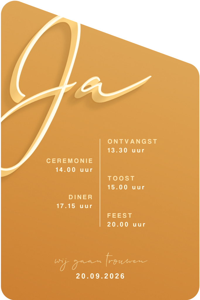 Een bijzondere trouwkaart speciaal voor jullie, als uniek bruidspaar! Deze huwelijksuitnodiging is gesneden in een originele vorm: met een schuine bovenzijde en afgeronde hoeken. De tijdlijn geeft exact de planning van de dag van jullie dromen weer. Het woord 'Ja' springt er extra uit door het 3D effect. Kleuren en teksten pas je eenvoudig aan in onze editor.