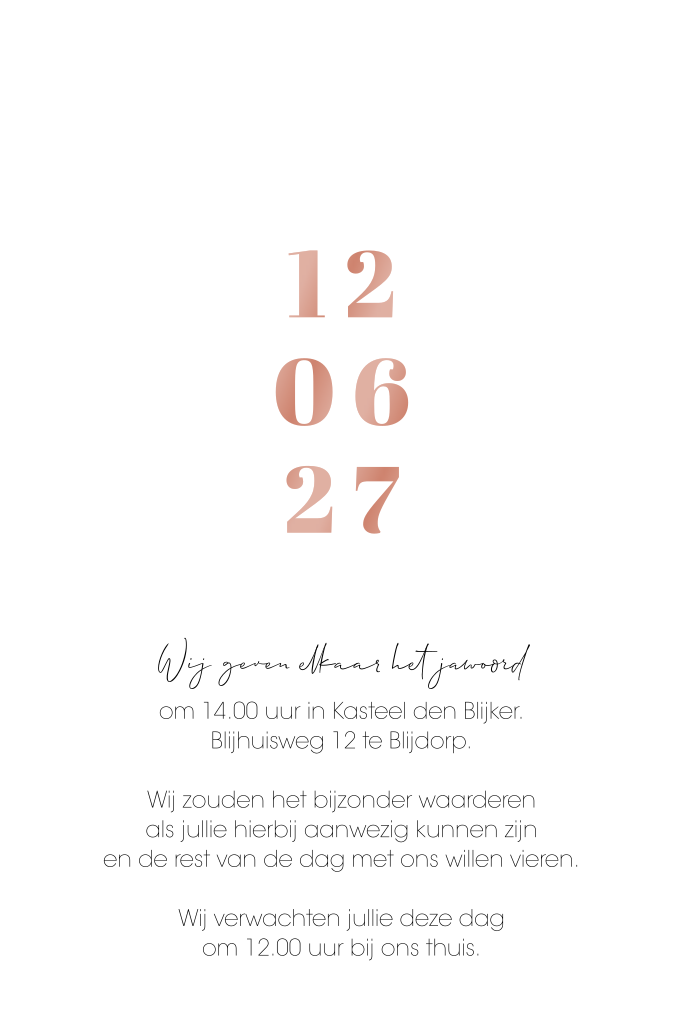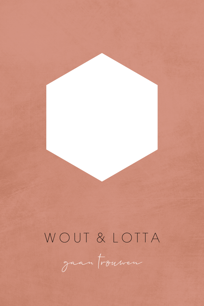 Moderne trouwkaart met uitsnede van een hexagon. Door deze zeshoek uitsnede is jullie trouwdatum te zien. De trouwdatum wordt gedrukt in écht hoogglans folie. Dit geeft, samen met de uitsnede, een luxe uitstraling aan deze rustige basic trouwkaart. Je kunt deze kaart zelf bewerken in de editor en naar je eigen wensen aanpassen.