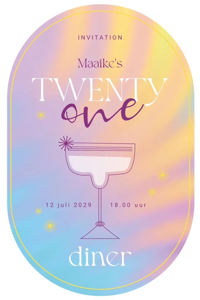 Feestelijke uitnodiging voor een 21 diner! Op de achtergrond van deze kaart een sprankelende pastellook. Het kaartje heeft een ovale vorm met een opvallend ovaal kader. Op het kaartje zie je een groot cocktailglas staan voor een twenty one diner. Teksten en kleuren kun je gemakkelijk aanpassen in onze online editor. Maak deze uitnodiging helemaal in stijl af met de lavendel envelopkleur.