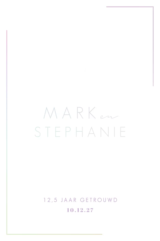 Moderne strakke uitnodiging met uitsnede van een hartje. Jullie namen als 12,5-jarig jubileumpaar, de tekst '12,5 jaar getrouwd' en de lijnen worden gedrukt in holografisch folie. Dit geeft, samen met de uitsnede van het hartje, een luxe uitstraling aan deze rustige basic jubileumkaart. Je kunt deze kaart zelf bewerken in de editor en naar je eigen wensen aanpassen.