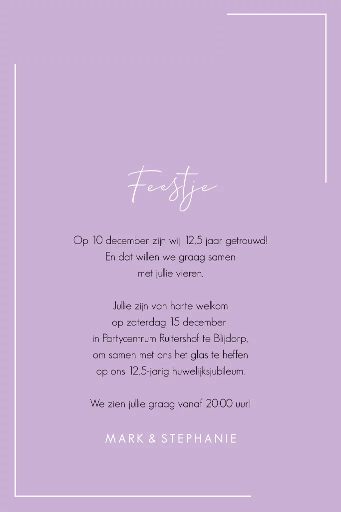 Deze uitnodigingskaart kun je gemakkelijk bewerken naar een ander jubileumjaar zoals 40 of 50 jaar getrouwd of te gebruiken om te vieren dat je bijvoorbeeld 25 jaar samen bent of een werk gerelateerd jubileum feest wilt geven.