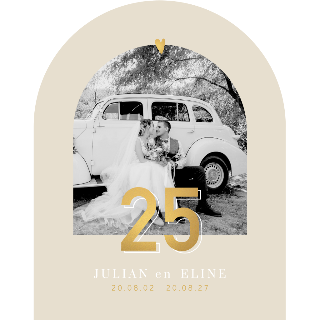 Wat een mooie manier om je 25-jarig huwelijksjubileum te vieren! Dit unieke ontwerp is een echte eyecatcher en zal zeker indruk maken op je gasten. De kaart wordt gesneden in een boogvorm. De foto in het midden maakt het ontwerp helemaal af en geeft het een extra persoonlijke touch. Het huwelijksjubileum 25 heeft een prachtige goudlook en springt er hierdoor extra uit.