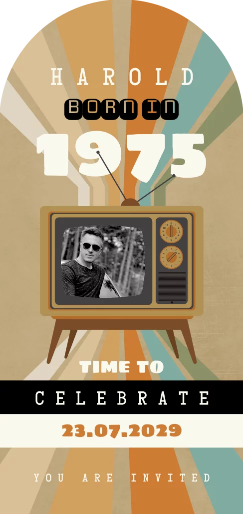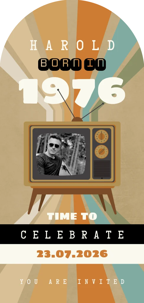 Bijna 50 jaar? Time to celebrate! Vier met deze bijzondere kaart, in de vorm van een boog, dat jij Abraham hebt gezien. Op deze verjaardag uitnodiging voor 50 jaar staan verschillende lettertypes met een retro televisie. Zet in de tv je eigen foto en maak van deze kaart je eigen persoonlijke uitnodiging. De gehele combinatie van kleuren en lettertypes geeft deze kaart een retro en vintage uitstraling. Je kunt deze uitnodiging zelf gemakkelijk bewerken, opslaan en bestellen.