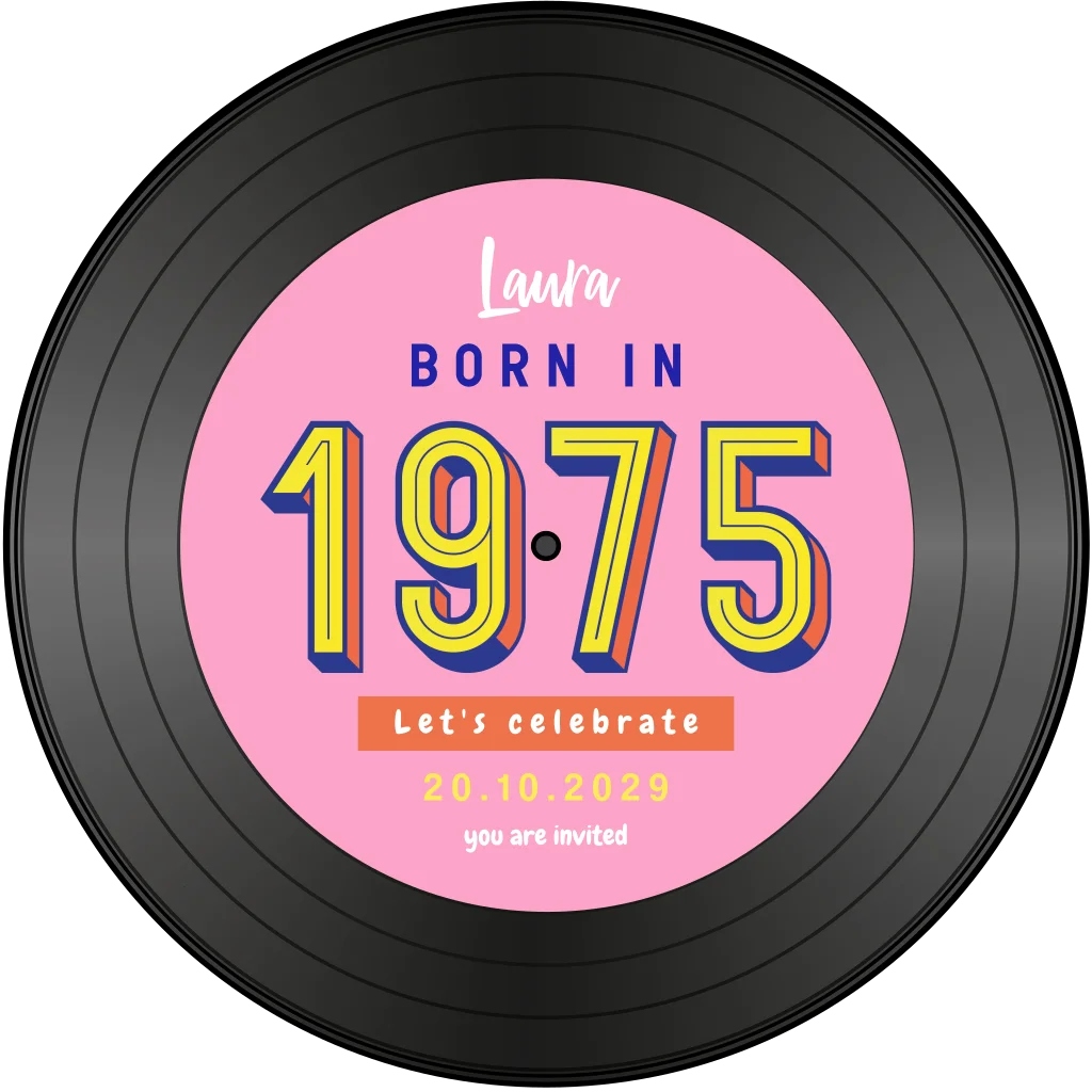 Born in 1975? Let's celebrate! Originele uitnodiging voor een 50ste verjaardag, uitgesneden in een ronde vorm van een lp. Op deze verjaardag uitnodiging staan verschillende lettertypes in verschillende kleuren tegen een roze achtergrond. Het jaartal springt er extra uit! De gehele combinatie van kleuren en lettertypes geeft deze kaart een retro uitstraling.