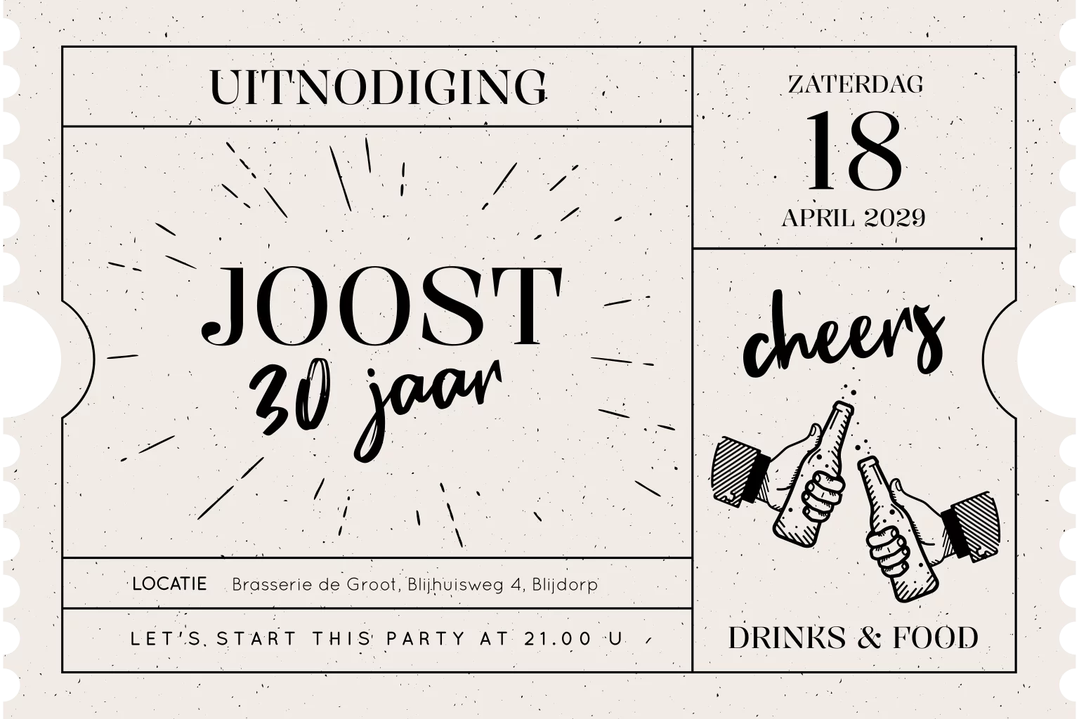 Cheers, een toffe ticketuitnodiging voor je 30e verjaardag! Deze stoere, beige uitnodiging bevat allerlei vlakken waar je informatie kwijt kunt over je feest. Pas deze uitnodiging voor een man naar eigen wens aan in onze online editor. De zand met gouden inlay envelop zorgt voor een extra vleugje luxe.