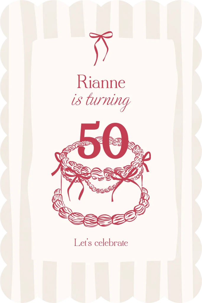 Stijlvolle en hippe uitnodiging voor een verjaardag. Vier je 50ste verjaardag met deze originele uitnodiging voor een verjaardag. De kaart heeft een aparte vorm van golven met een strepen achtergrond in beige kleuren. In het kader staat een illustratie van een taart met strikjes en de leeftijd 50 erop. Pas alles geheel naar eigen wens aan in de editor. De metallic rode envelop maakt dit kaartje helemaal in stijl af.