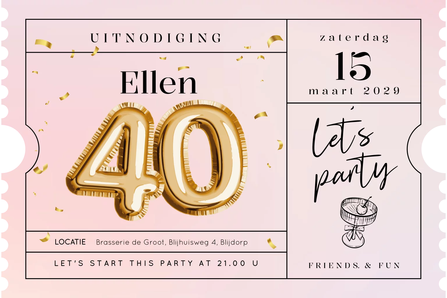 Verjaardagsuitnodiging in ticket vorm 40 jaar met ballon cijfer