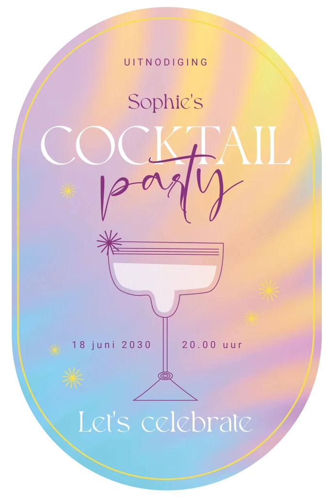 Feestelijke uitnodiging in ovalen vorm! Op de achtergrond van deze kaart een sprankelende pastellook. Het kaartje heeft een ovale vorm met een opvallend ovaal kader. Op het kaartje zie je een groot cocktailglas staan met de tekst 'cocktail party'. Teksten en kleuren kun je gemakkelijk aanpassen in onze online editor. Maak deze uitnodiging helemaal in stijl af met de lavendel envelopkleur.