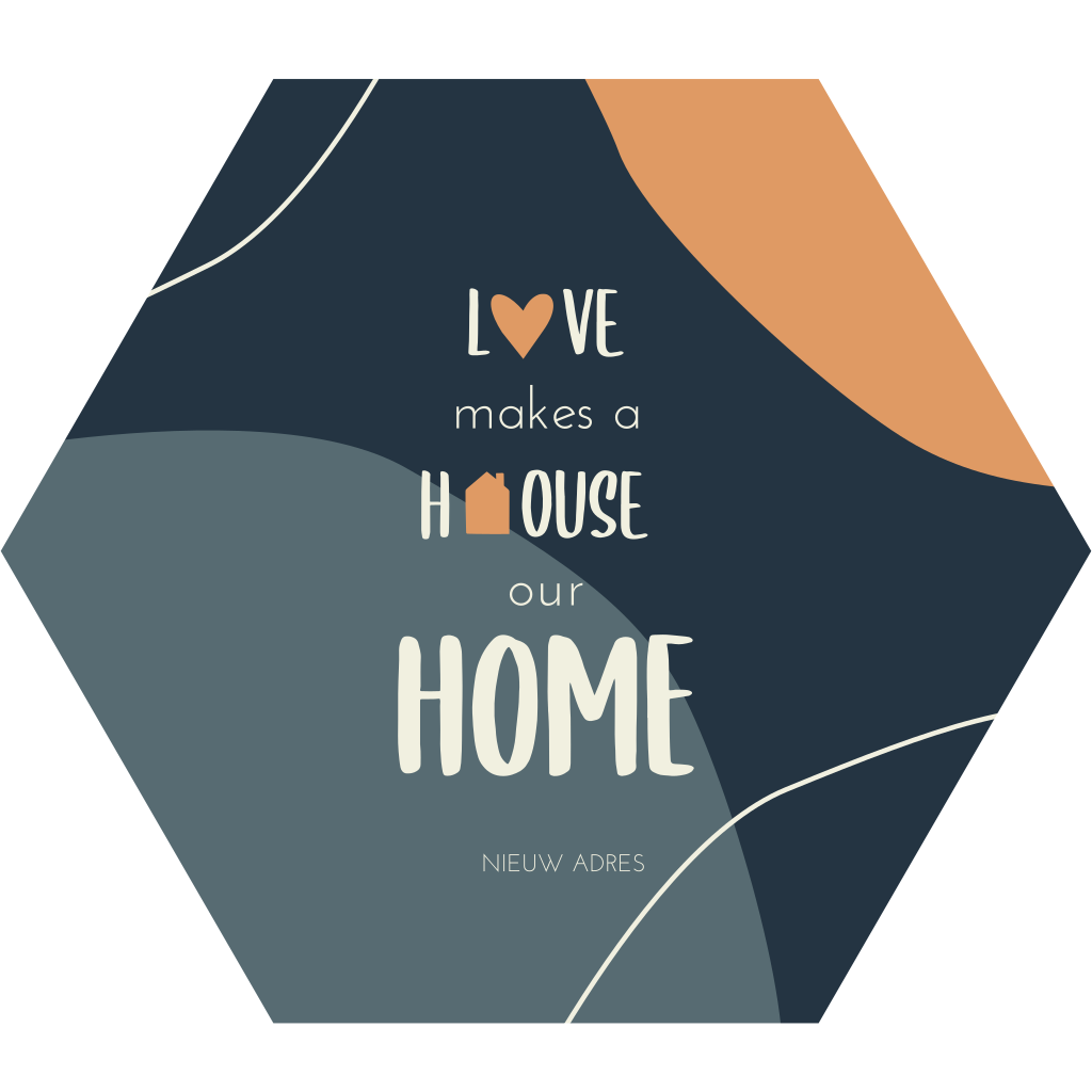 Willen jullie echt een bijzondere kaart om te laten weten dat jullie gaan verhuizen? Kies dan voor deze moderne verhuiskaart, gesneden in unieke hexagon vorm. Echt even wat anders dan anders! Op dit verhuisbericht abstracte vlakken en lijnen, en afbeeldingen van een hartje en huisje in de woorden Love en House.