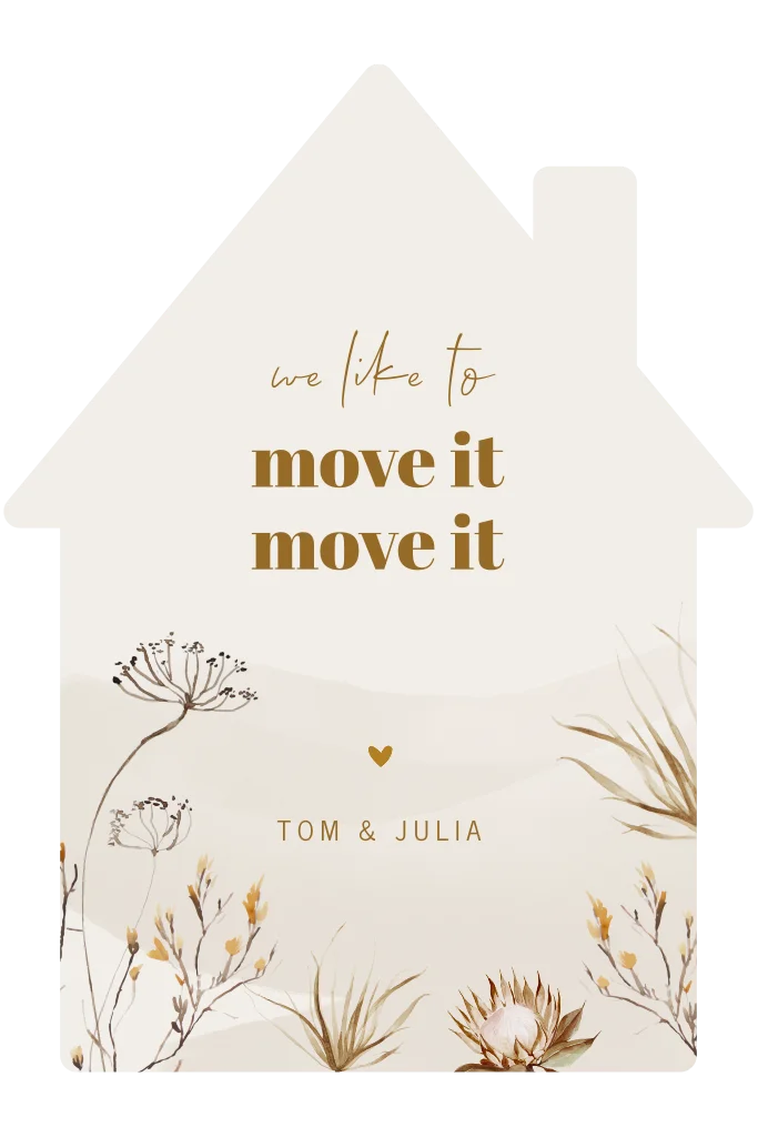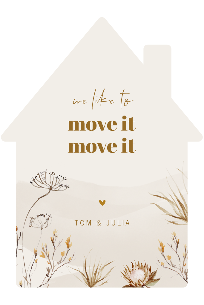 We like to move it, move it. Gaan jullie verhuizen? Of samenwonen? En willen jullie dit met een originele kaart laten weten? Kies dan voor deze verhuiskaart, gesneden in de vorm van een huisje. Net even wat anders dan anders! Deze kaart heeft rustige natuurlijke kleuren, mooie droogbloemen en een aquarel veeg op de achtergrond. Liever andere kleuren, teksten of lettertypes? Pas dit gerust naar eigen smaak aan in onze ontwerpmodule.