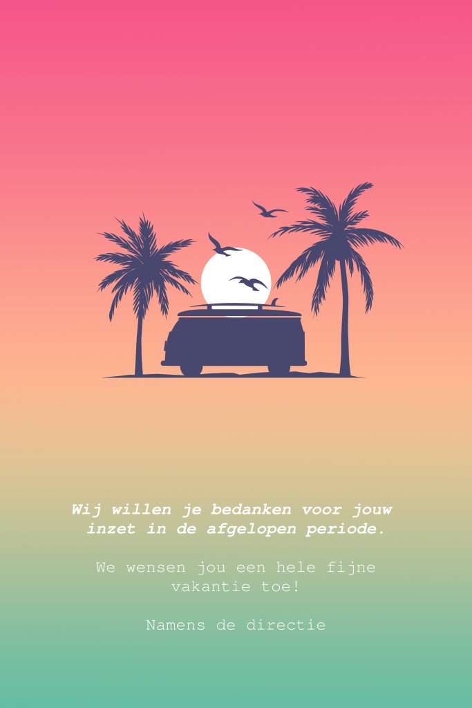 Zomerse zakelijke uitnodiging om je personeel te bedanken voor hun inzet en een fijne vakantie te wensen. Uniek aan deze kaart is de ronde uitsnede, waardoor je een hippie busje ziet met op de achtergrond de zon, vogels en palmbomen. Daarnaast is er ruimte om een eigen logo op de voorzijde te plaatsen.