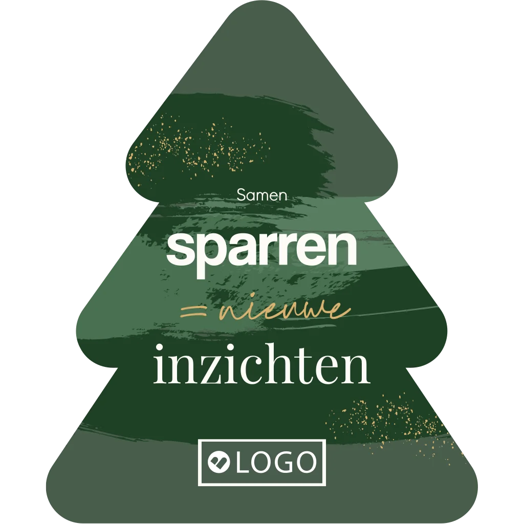 Stuur je zakelijke relaties, medewerkers en klanten een kerstkaart in deze bijzondere vorm: een kerstboom. Op deze zakelijke kerstkaart staat de tekst: samen sparren = nieuwe inzichten. Op de achtergrond groene vegen en gouden spetters. Er is ruimte om je eigen bedrijfslogo te plaatsen. Geschikt voor iedere branche.