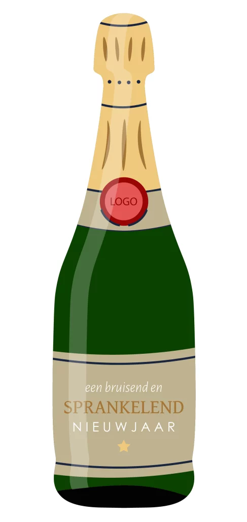 Bedank al je zakelijke relaties, medewerkers en klanten voor het afgelopen jaar en wens ze fijne feestdagen en een Gelukkig nieuwjaar met deze unieke zakelijke kerstkaart. Uniek aan deze kerstkaart is de aparte vorm, namelijk de vorm van een champagnefles. De afbeelding van het logo dient als voorbeeld en wordt niet gedrukt. Deze kun je verwijderen of plaats hier je eigen logo overheen.