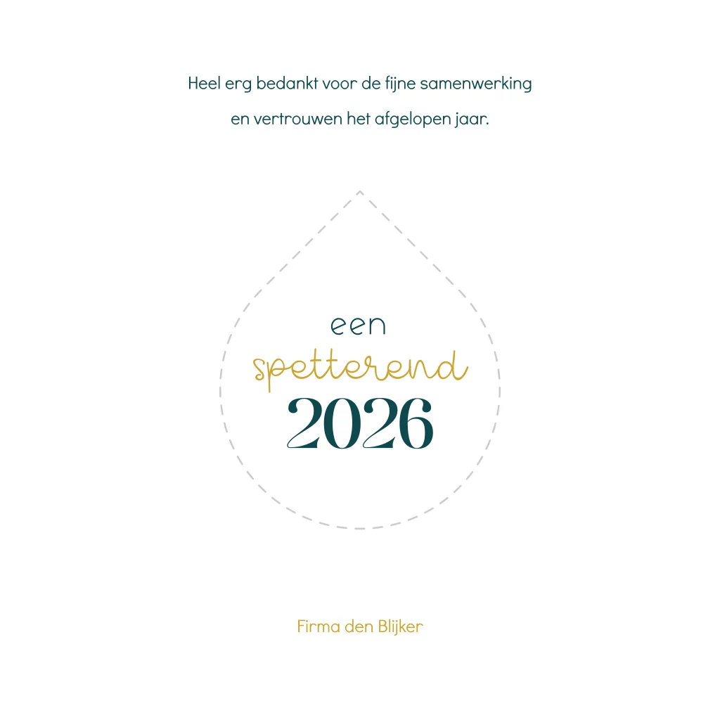 Unieke zakelijke kerstkaart met uitsnede. Deze kaart heeft een prachtige blauwe achtergrond met sprankelende stippen en een uitsnede van een waterdruppel. De uitsnede geeft een doorkijkje naar de binnenkant van de kaart waar de toepasselijke tekst 'een spetterend 2026' staat. Deze kaart is daarom vooral geschikt voor bedrijven die met water te maken hebben zoals een installatiebedrijf of loodgieter.